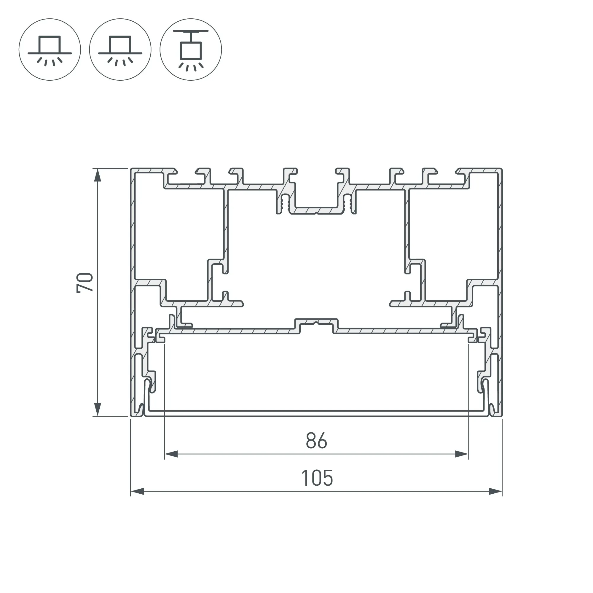 Комплект с экраном. Алюминиевый анодированный профиль для светодиодных лент и линеек. Габаритные размеры (L×W×H): 2500x105x70 мм. В комплекте профиль, основание для ленты, PC матовый экран, фиксаторы основания 4шт, винты. Отсек для БП 50х25мм (±1 мм). Ширина площадки для ленты 86 мм. Светопропускание экрана 85%. Аксессуары приобретаются отдельно.