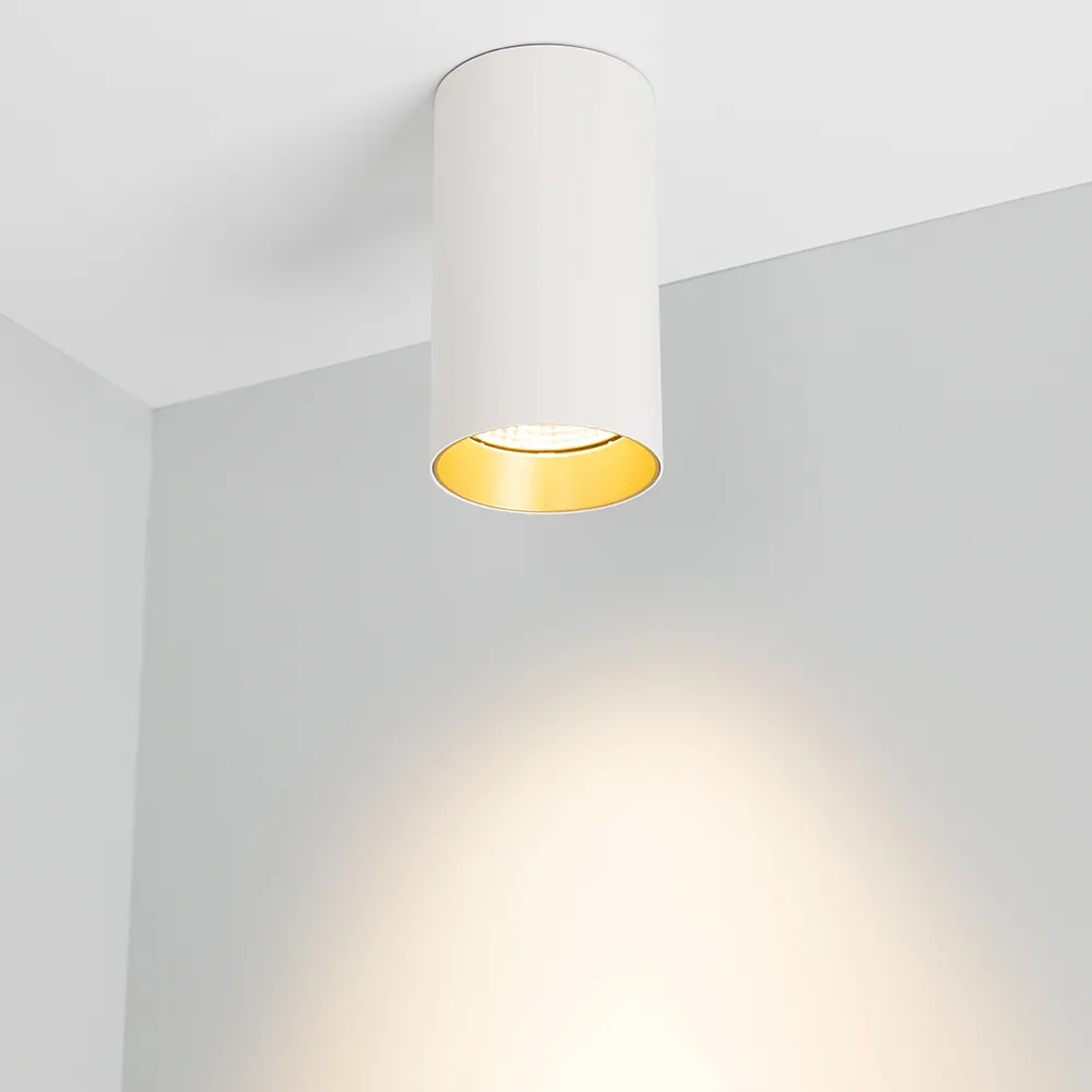 Накладной светильник 15Вт, белый круглый корпус, золотистая вставка, металл. Цвет ТЕПЛЫЙ БЕЛЫЙ 3000K, св.поток 1100лм, CRI(Ra)>80, угол 40°. Размер Ø85x155мм. Встроенный драйвер PRI:220-240VAC, SEC:DC 500mA 23-36V 15Вт.