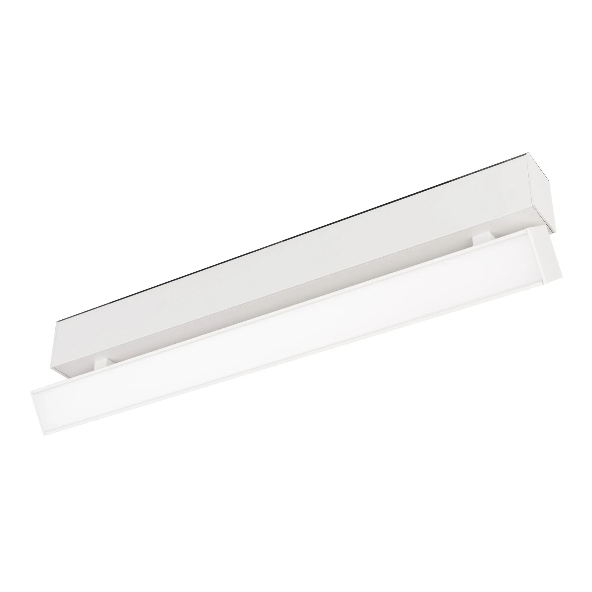 Светильник поворотный для магнитных треков шириной 45мм, 12Вт. Цвет свечения ТЕПЛЫЙ 3000K, световой поток 1200лм, угол 100°, CRI>90. Корпус прямоугольный, металл, цвет белый, IP20. Размеры LxWxH 404x35x92.5мм. Входное напряжение DC24V, мощность 12Вт. Драйвер DС24V/AC230V поставляется отдельно. Не диммируется.