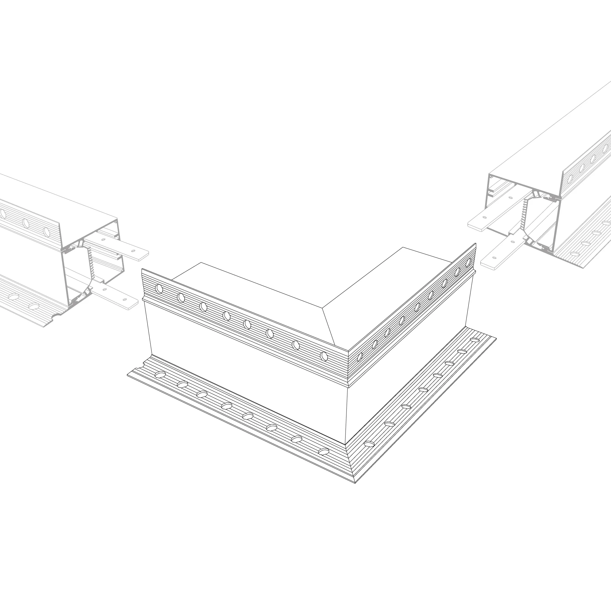 Угол в сборе, для профиля SL-LINIA55-FANTOM-EDGE. Свечение наружу. В комплекте угол с экраном, соединители, винты, шестигранный ключ.