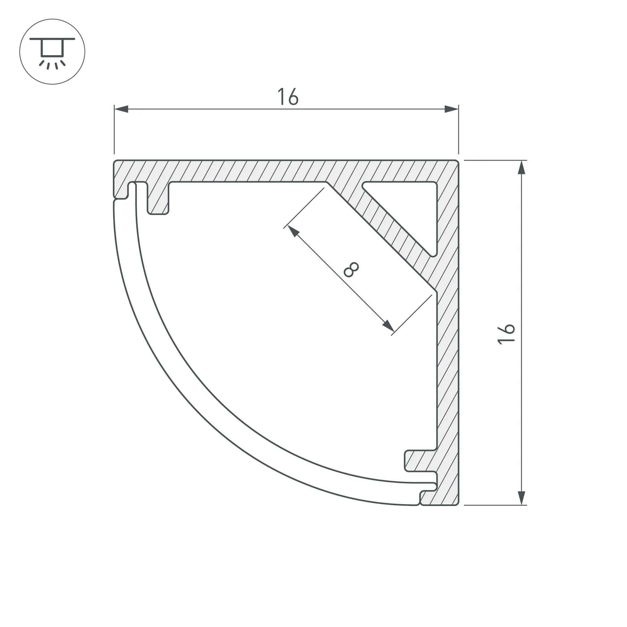 Комплект с круглым экраном. Алюминиевый анодированный угловой профиль для светодиодных лент и линеек. Габаритные размеры (L×W×H): 2000x16x16 мм. Ширина площадки для ленты 8 мм. Упакован в картонный тубус диаметром 27 мм.
