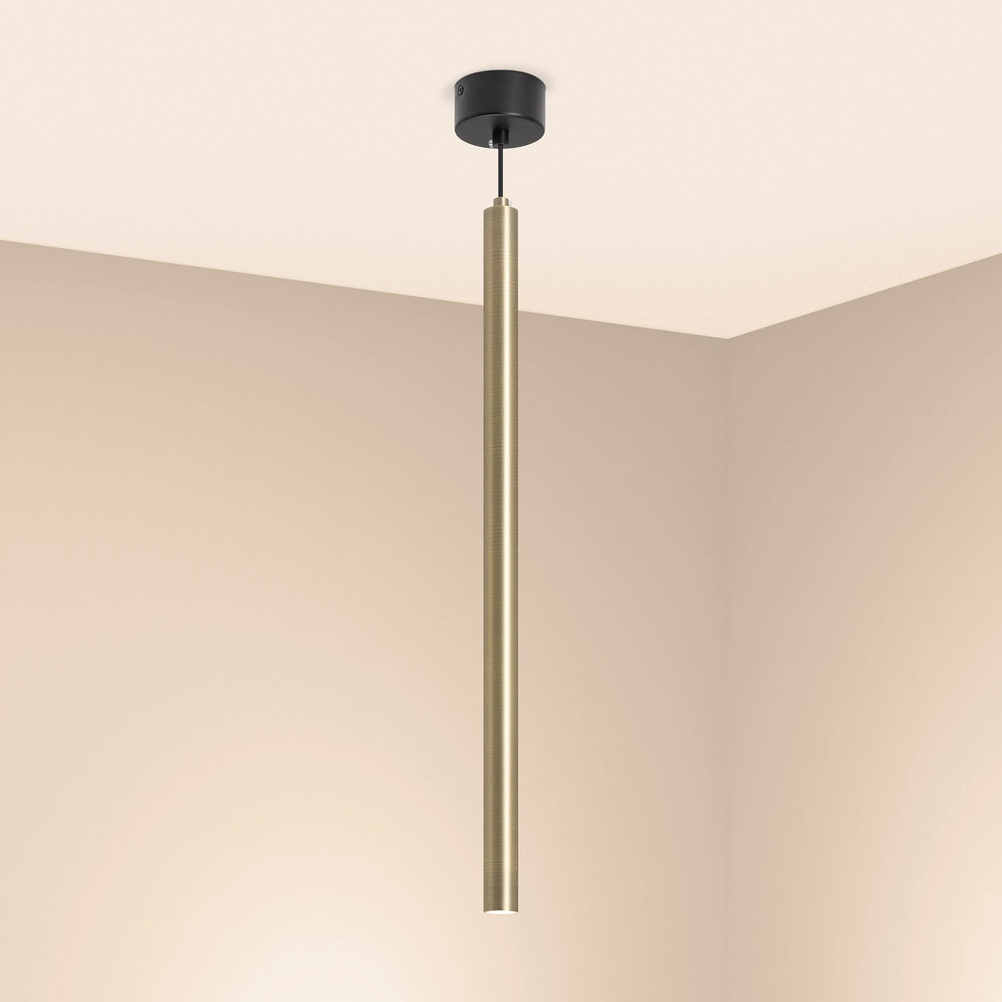 Подвесной светильник. Мощность 9 Вт, св. поток 561 лм, 64 лм/Вт, теплый 3000 K, CRI>90, угол 24°, напряжение питания 230 В. Бронзовый круглый корпус из алюминия, рассеиватель PC, степень защиты IP20. Размер: диаметр 30 мм, длина 600 мм, размер чаши: диаметр 80 мм, высота 40 мм. Монтаж подвесной, длина подвеса 1500 мм. Драйвер 28-42 В, 200 мА, пульсация <1%.