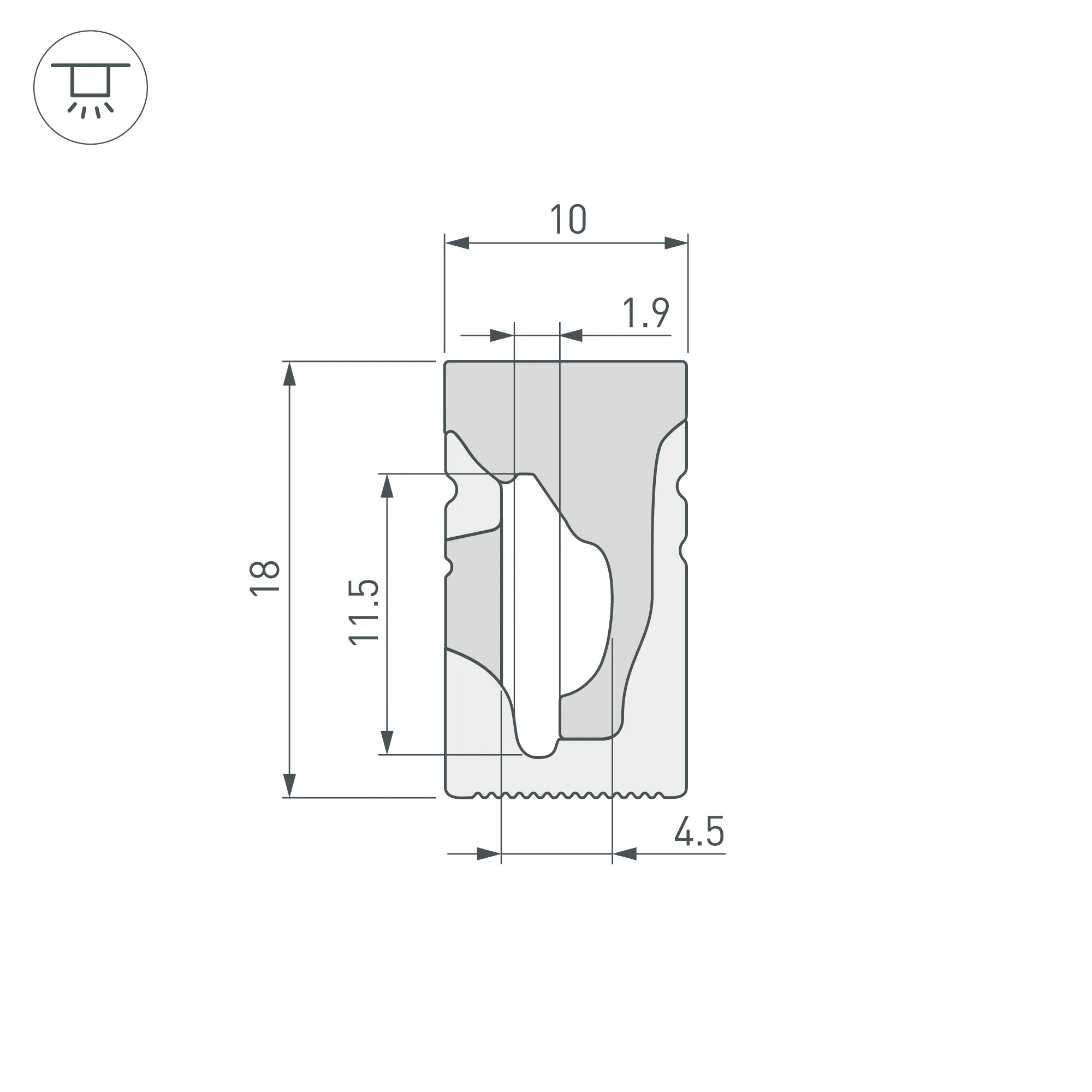 Цельнолитой силиконовый гибкий профиль, белый матовый. Габаритные размеры 5000×10×18 мм. Горизонтальный изгиб SIDE, минимальный радиус изгиба 30 мм. Для установки во влажных помещениях необходима герметизация при помощи двухкомпонентного эпоксидного герметика. Класс пылевлагозащиты – IP65 (при соблюдении технологии герметизации). Для лент шириной от 8 до 10 мм, высотой до 3,5 мм и мощностью до 10 Вт/м. При подборе ленты необходимо учитывать, что втяжка лент COB, герметичных лент и лент с наличием силиконового слоя может быть затруднена. Угол излучения 125°. Поставляется в катушках по 5 м. Цена за 1 м.