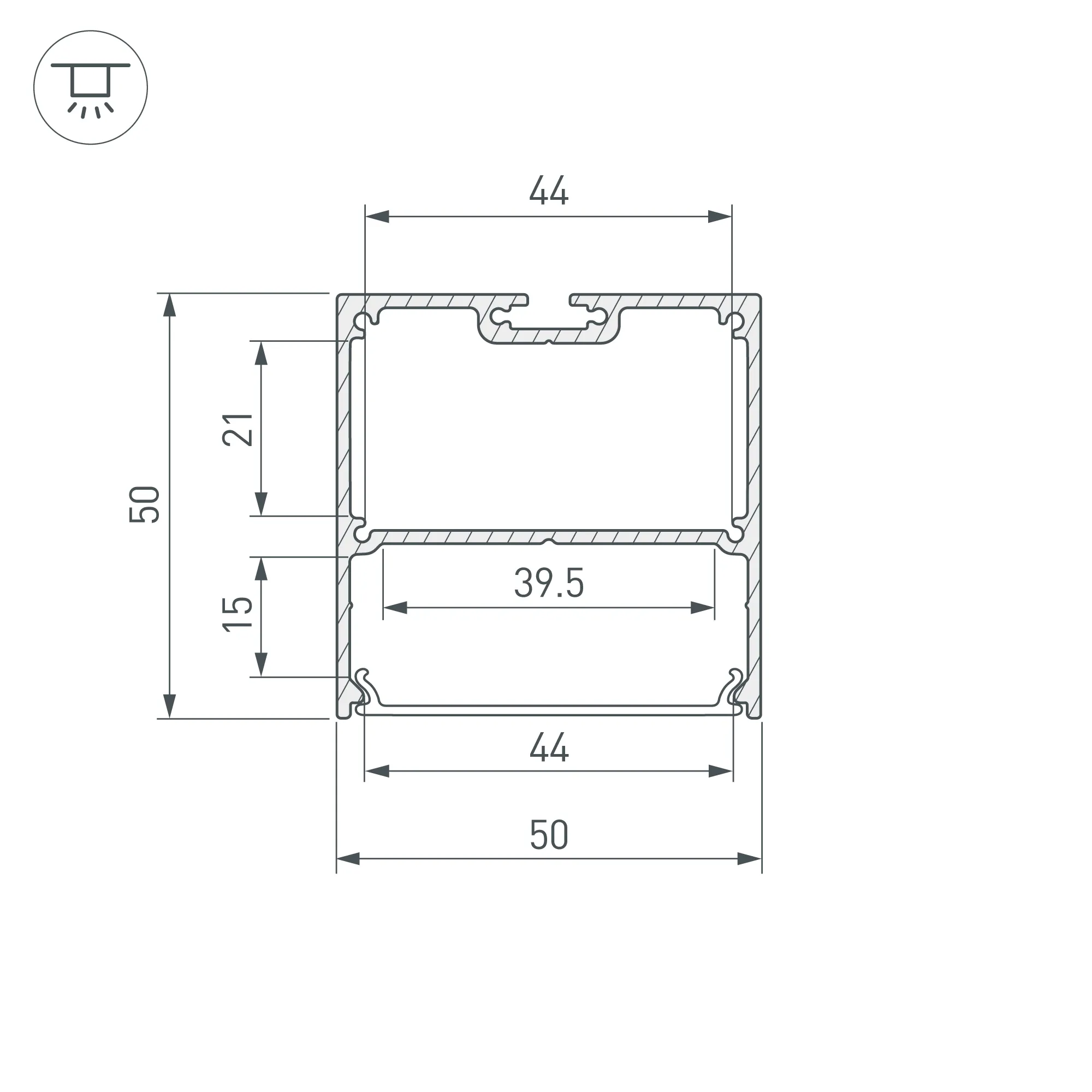 Алюминиевый анодированный профиль для светодиодных лент и линеек. Габаритные размеры (L×W×H): 3000x50x50 мм. Ширина площадки для ленты 39,5 мм. Отсек для БП 44х21 мм. Экраны, заглушки и другие аксессуары приобретаются отдельно. Цена за 1 метр.