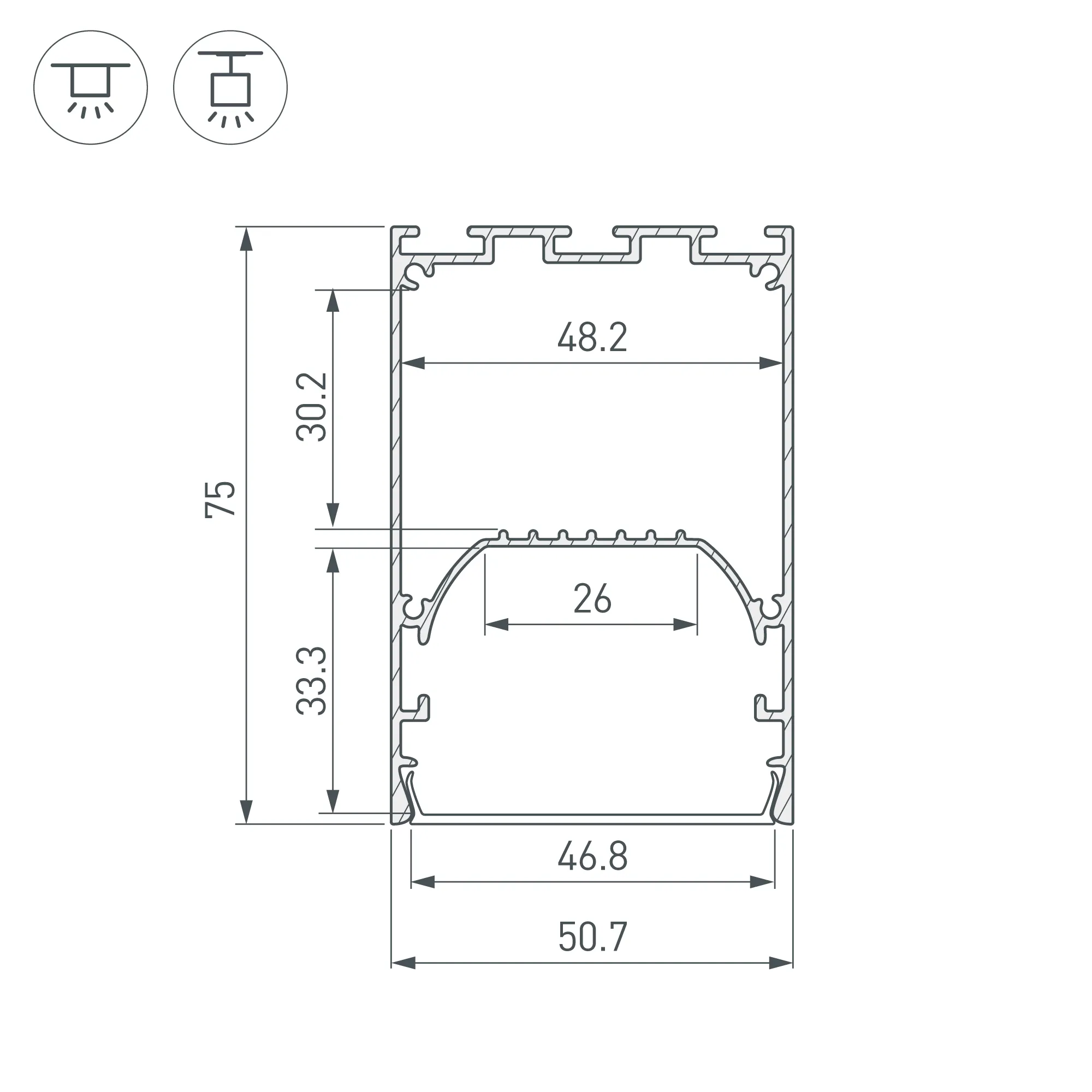 Алюминиевый анодированный профиль для светодиодных лент и линеек. Габаритные размеры (L×W×H): 2000x50,7x75 мм. Ширина площадки для ленты 26 мм. Отсек для БП 48,2х30,2 мм. Экраны, заглушки и другие аксессуары приобретаются отдельно. Цена за 1 метр.