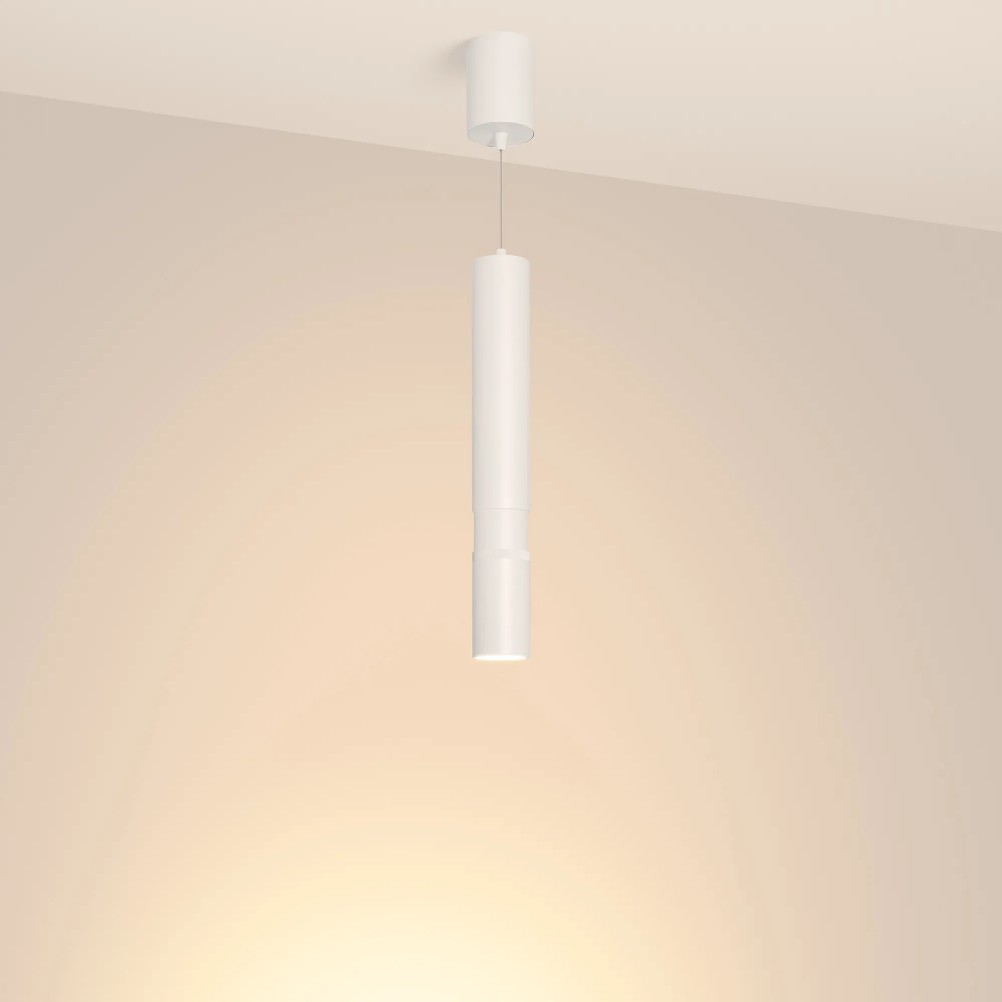 Декоративный подвесной светильник, 15Вт. Изменяемый цвет свечения 2700K/ 3300K/4000K (переключается), световой поток 288-1240 лм, 20-80 лм/Вт, регулируемый угол 8-80°, CRI>90. Корпус круглый, металл, цвет белый, IP20. Размеры светового модуля: DxH Ø60x370(430) мм, подвес регулируемый, макс. длина 1550 мм. Размер чаши Ø75x100 мм. Входное напряжение AC220-240V, мощность 15Вт. Драйвер встроенный 25-40V, 300 мА. Пульсация <1 %. Диммирование по TRIAC.