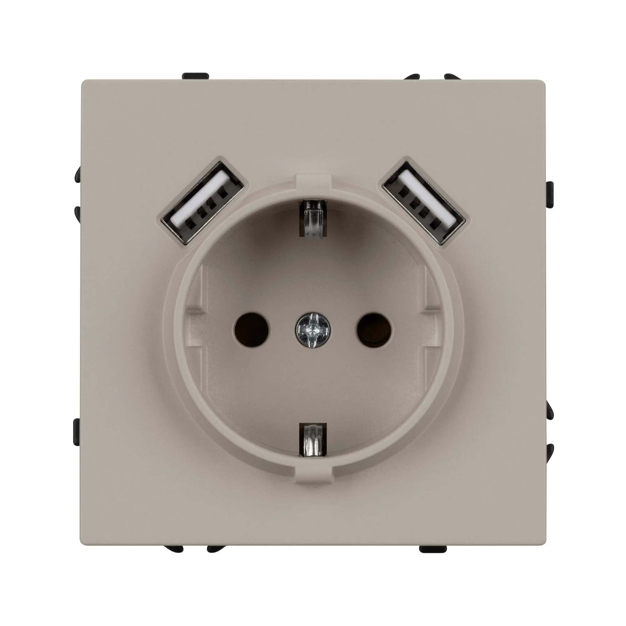 Механизм розетки с заземлением на 1 пост и 2USB Type A порта. Цвет - кашемир, с Soft-Touch поверхностью. Без фронтальной рамки. Уровень пылевлагозащиты IP20. Розетка устанавливается в стандартный подрозетник круглого сечения диаметром 60мм.